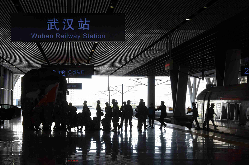 圖六:2月17日,軍隊支援武漢抗擊新冠肺炎疫情的醫護人員乘坐高鐵抵達武漢。