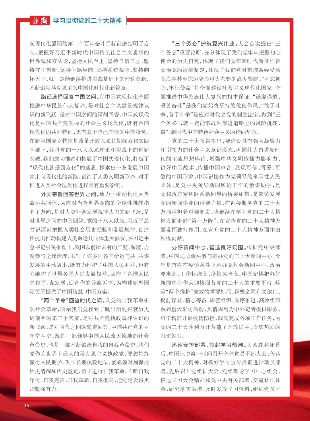 黨的二十大報(bào)告提出,要建設(shè)具有強(qiáng)大凝聚力和引領(lǐng)力的社會(huì)主義意識(shí)形態(tài),鞏固壯大奮進(jìn)新時(shí)代的主流思想輿論,增強(qiáng)中華文明傳播力影響力,講好中國(guó)故事、傳播中國(guó)聲音,展現(xiàn)可信、可愛(ài)、可敬的中國(guó)形象。中國(guó)記協(xié)作為黨領(lǐng)導(dǎo)的全國(guó)性人民團(tuán)體,是黨中央領(lǐng)導(dǎo)新聞?shì)浾摴ぷ鞯膮⒅\助手,是黨和政府密切聯(lián)系新聞界的橋梁紐帶,是繁榮發(fā)展黨的新聞事業(yè)的重要力量,在迎接服務(wù)黨的二十大方面承擔(dān)著重要職責(zé),將繼續(xù)在學(xué)習(xí)黨的二十大精神方面走好“第一方陣”,在宣傳黨的二十大精神方面發(fā)揮獨(dú)特作用,在宣介黨的二十大精神方面作出積極貢獻(xiàn)。