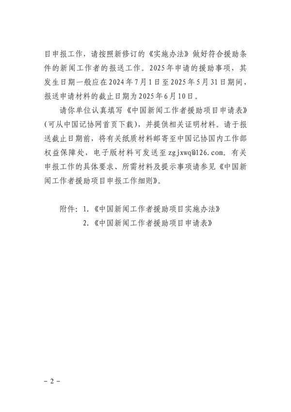 请填写《中国新闻工作者援助项目申请表》并加盖公章,连同相关证明材料复印件,于2025年6月10日前邮寄至中国记协国内工作部权益保障处。