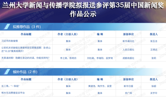 现对以上作品进行公示,公示时间为2025年6月3日至6月10日,欢迎社会各界监督。如您对以上作品有疑问或意见,可向兰州大学新闻与传播学院中国新闻奖初评委员会反映。
