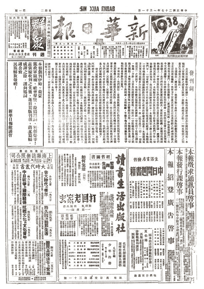 1938年初,武汉会战尚未打响,但日军铁蹄已遍及东北、华北、华东等地。上海、南京、北平等大城市相继沦陷。出版界纷纷推出反映抗战历程和最新进展,以及对公众进行国防教育的书籍。《新华日报》创刊号图书广告中涉及的《长城察北的抗战》《日本铁蹄下的东北》《抗战将领印象记》《空袭与防空》《青年军事常识》《后方民众怎么干》《中国国防经济建设》《国民兵役法令的实施》《中国怎样降到半殖民地》等都是此类读物,《日本在华间谍网》《汉奸的产生和扑灭》这两种书则提醒民众要提防身边的日本间谍,积极铲除卖国求荣的汉奸。