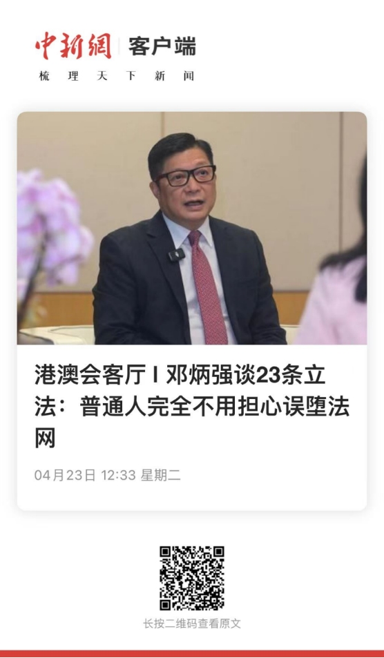 作品标题:港澳会客厅|邓炳强谈23条立法:普通人完全不用担心误堕法网
