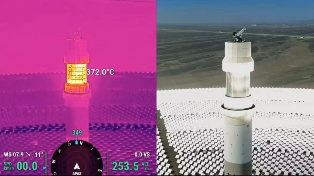 红外热成像镜头实时捕捉到光热能量转化的过程。左图为红外热成像镜头,右图为吸热塔实时画面。